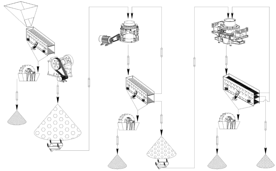 首先开采的鹅卵石通过振动筛进行筛分,将细小的符合要求的通过洗砂机直接制成成品料、不满足粒度要求的先通过颚式破碎机进行一级破碎,然后通过皮带机送入到圆锥破中进行二级破碎,破碎后的物料再次通过振动筛进行筛分,符合要求的通过洗砂机进行洗砂,不符合的物料通过皮带机送入到鹅卵石德赢vwin8868官网中进行制砂、整形。再由振动筛进行筛分,降符合要求粒度大小的物料进行洗砂,不符合要求的物料再次通过鹅卵石德赢vwin8868官网进行循环破碎,终得到成品物料。
