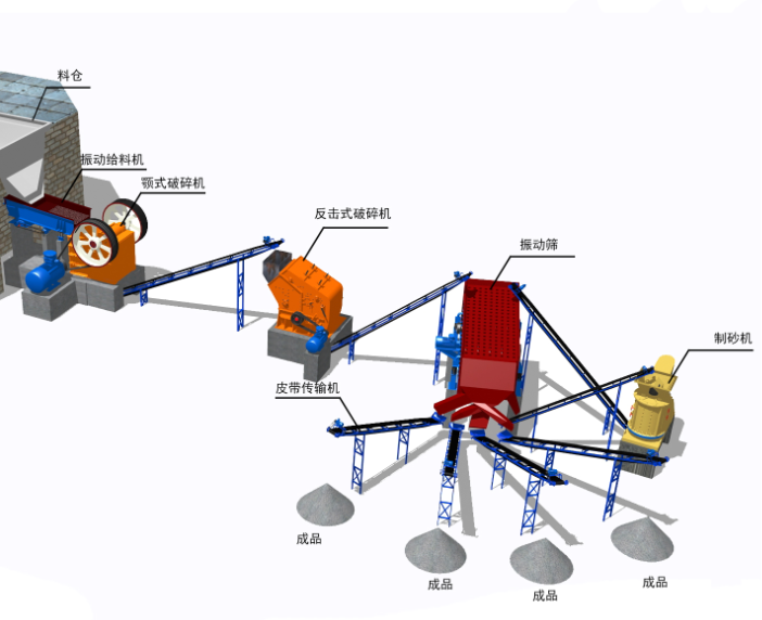 颚式破碎机+反击式破碎机/圆锥破碎机+德赢vwin8868官网+(洗砂机)+振动给料机+圆振动筛+皮带输送机等