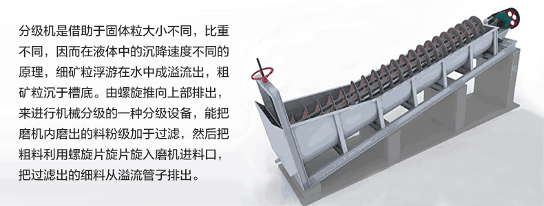 螺旋分级机是选矿的设备之一,螺旋分级机借助固体颗粒的比重不同,因而在液体中沉淀的速度不同的原理,进行机械分级的一种设备。螺旋分级机应用于处理冲积砂矿,尤其适合于有用矿物单体解离度高而且呈扁平状者。分级机主要有高堰式单螺旋和双螺旋、沉没式单螺旋和双螺旋四种分级机。