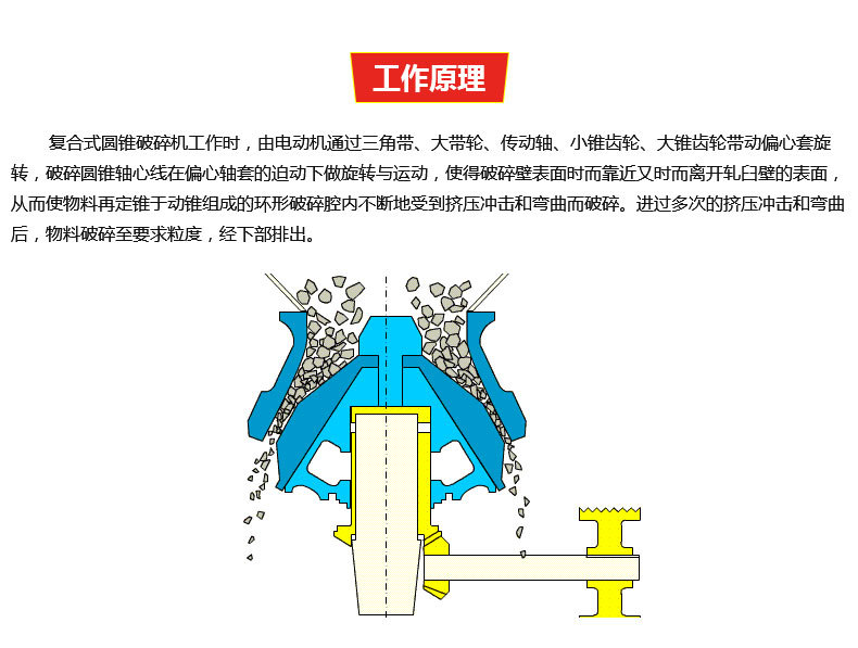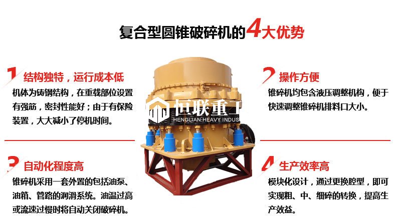 复合式圆锥破碎机是基于层压破碎原理和多破少磨概念设计研发的集高摆频、优化腔型和合理冲程于一体的高性能弹簧圆锥破。复合式圆锥破碎机之所以成为应用广泛的圆锥式破碎机,得益于其在各种工况环境下工作的可靠性,而CS系列极大程度上保留了其经典结构,如弹簧保险装置、大直径主轴、重型机架和干油密封等,设备可靠性得到更大程度保证。多种腔型可供选择,应用多种工况条件。CS系列高效弹簧圆锥式破碎机有标准型和短头型两种机型,每种机型又配备多种腔型,可以适用于各种硬度物料的中碎和细碎作业需求。在大量的实践应用中显示,CS系列高效弹簧圆锥破在用于中碎作业时性能尤为突出。