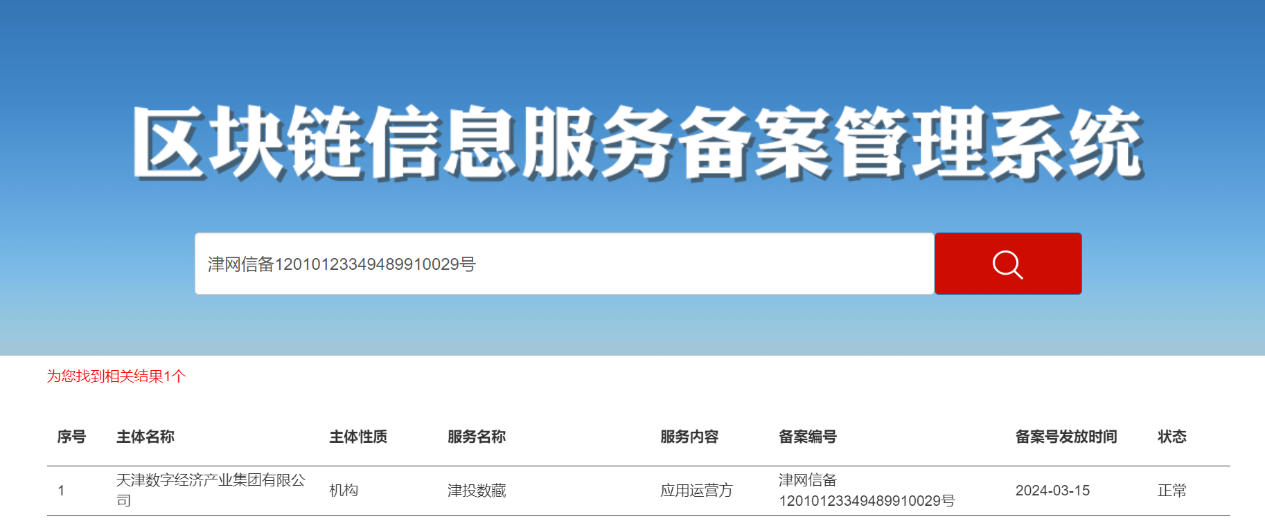 3月15日,国家互联网信息办公室发布了第十四批共247个境内区块链信息服务名称及备案编号,津投资本所属天津数字经济产业集团有限公司自主研发的“津投数藏”成功通过备案(津网信备12010123349489910029号)。