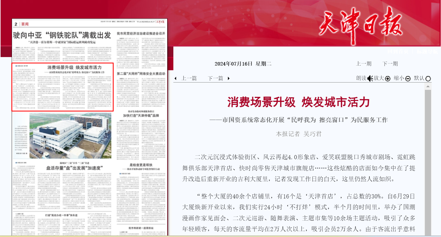 7月16日,《天津日报》“要闻”版面的《消费场景升级 焕发城市活力——市国资系统常态化开展“民呼我为 擦亮窗口”为民服务工作 》中,报道了津投资本联合劝华集团,将吉利大厦改造提升项目作为推动消费场景迭代升级,切实提高国企为民服务质量的有力抓手,惠及人民群众,履行国企社会责任。