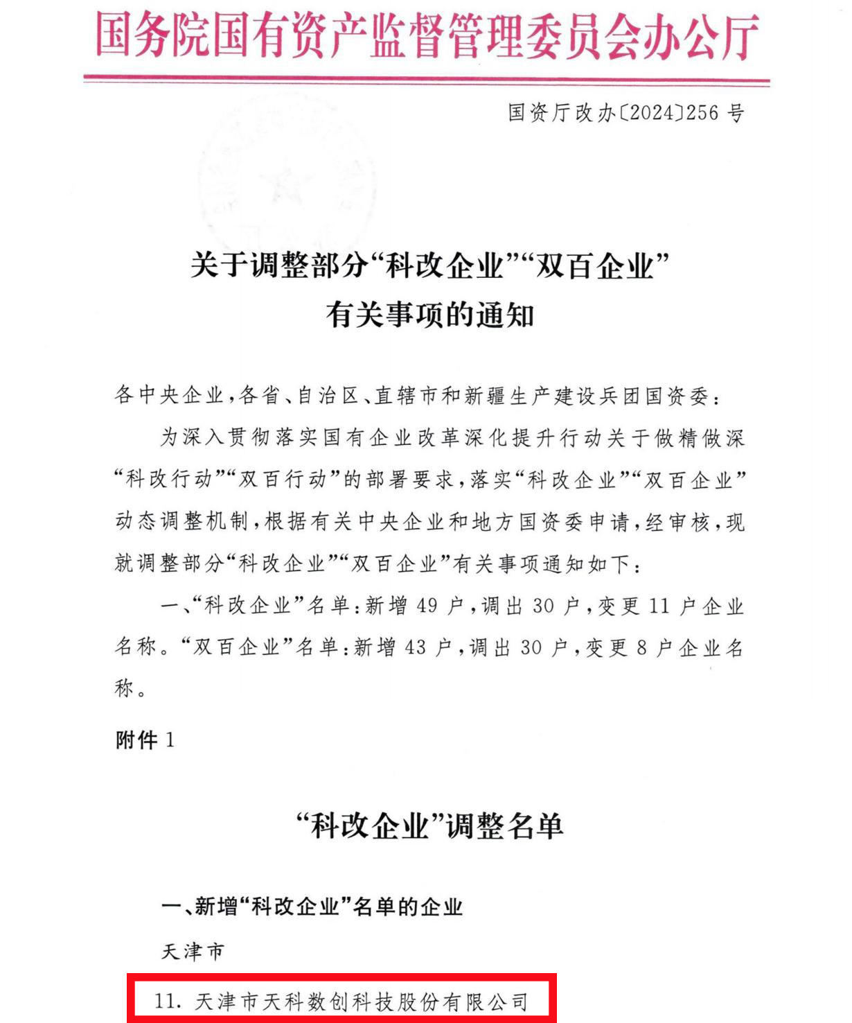 近日,国务院国资委办公厅印发《关于调整部分“科改企业”“双百企业”有关事项的通知》,津投资本所属天津数字经济产业集团有限公司旗下天津市天科数创科技股份有限公司(以下简称“天科数创”)成功入围 “科改企业”名单。