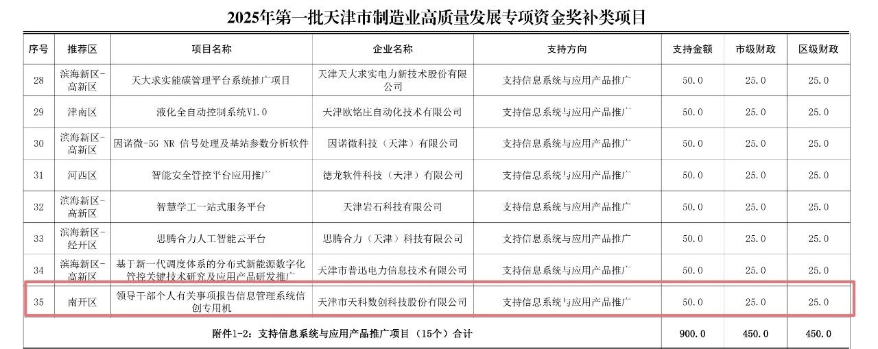喜报 | 天科数创自研信创产品入选2025年第一批天津市制造业高质量发展专项资金资助项目